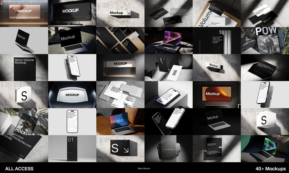 Access to All (43+) Micro Volume Mockups. Commercial and Personal Rights. Instantly Downloadable PSDs.